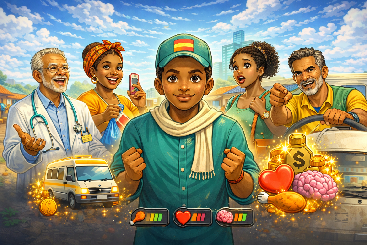 You're a trotro mate — a bus conductor hustling through the city. Pick up passengers, dodge traffic, manage your health, and make your sales before the day ends.